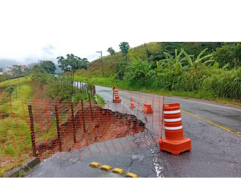 Parte do asfalto cedeu e uma cratera foi aberta na RJ-155, em Rio Claro (RJ). Segundo a prefeitura, o tráfego está fluindo em meia pista na altura do km 44, próximo a entrada da cidade. A informação foi confirmada na sexta-feira (24).